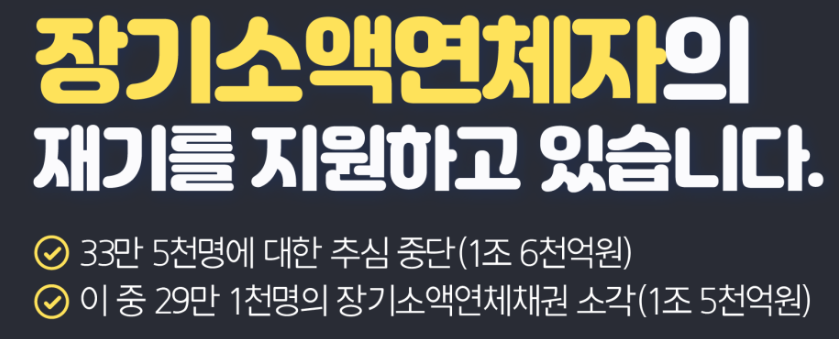 2017년 11월 정부가 발표한 장기소액연체자 재기 지원방안으로 10년이상 상환하지 못한 원금 1000만원 이하의 생계형 소액 채무를 탕감해 주는 제도 입니다