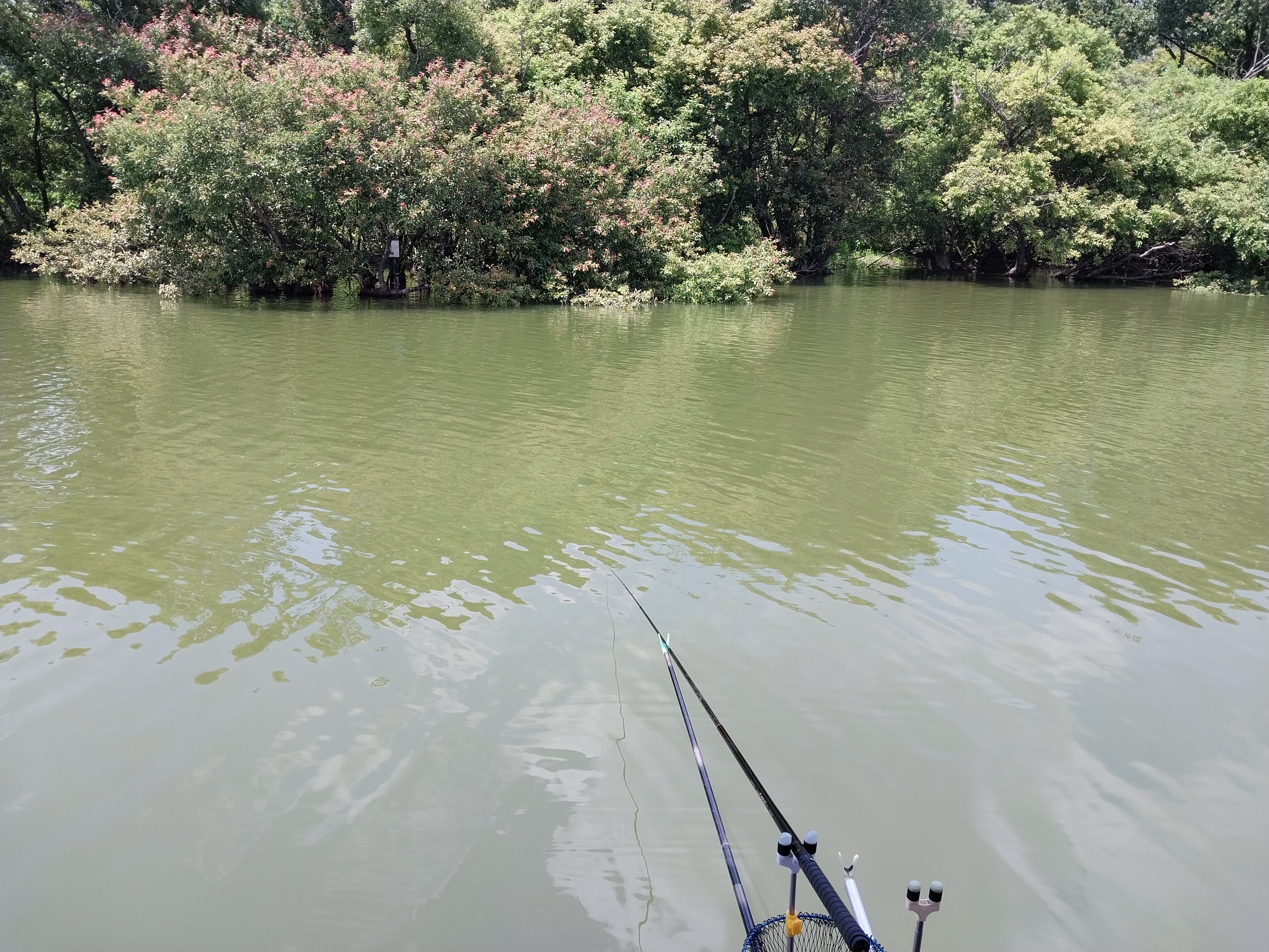 유리판을 얹어놓은 듯한 물~ 저수지 여기저기가 그림같은 풍경~ 하지만 낮엔 너무 더워 낚시에 집중하기가 힘들다